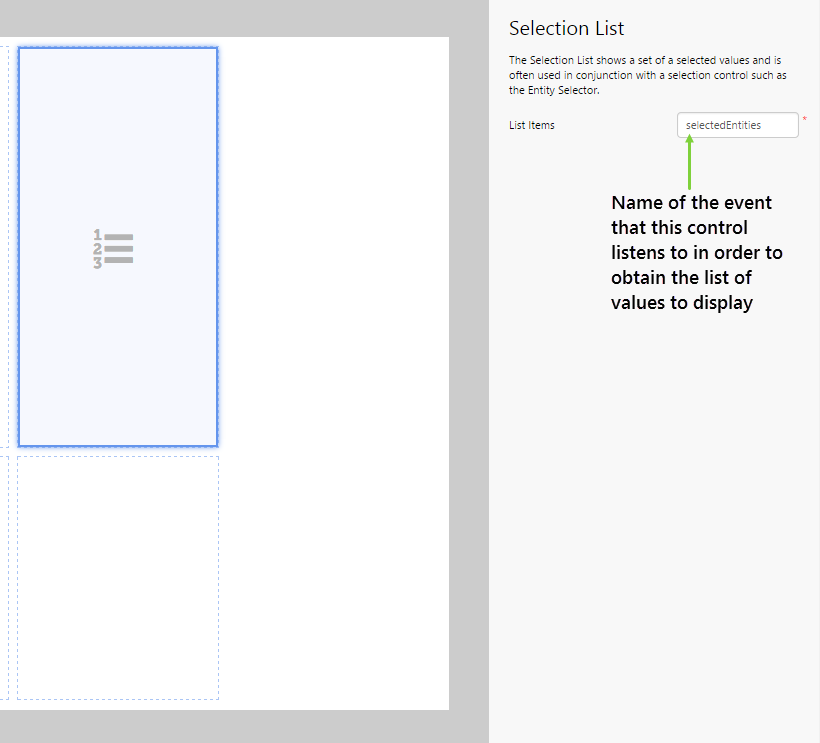 In this tutorial, we want to populate the Selection List from an event that is generated by an Entity Selector.  Let's call this "selectedEntities".