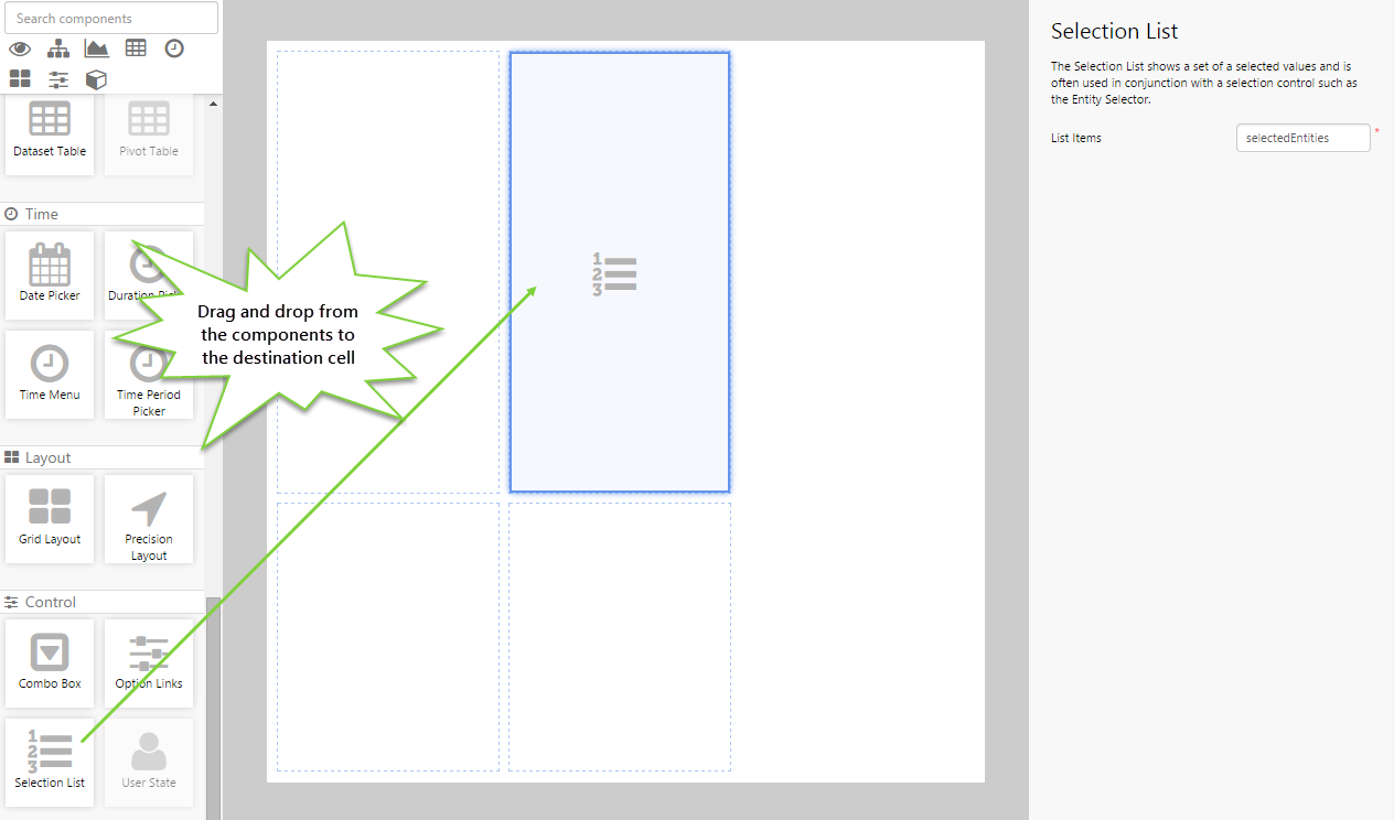 Drag and drop the Selection List component onto a grid cell.
