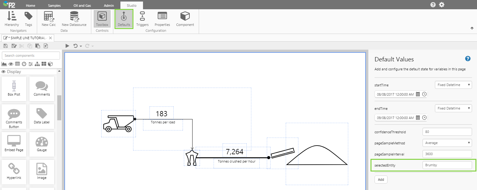 Let’s change the default data that is displayed. We do this by creating defaults for the variables specified in the components in the previous steps. The variable we are most interested in is the selectedEntity variable. Although this variable exists as a default value, no value has been assigned to it. We want the initial value of the Data Labels to show data for the mine, Brumby. We can set that here.