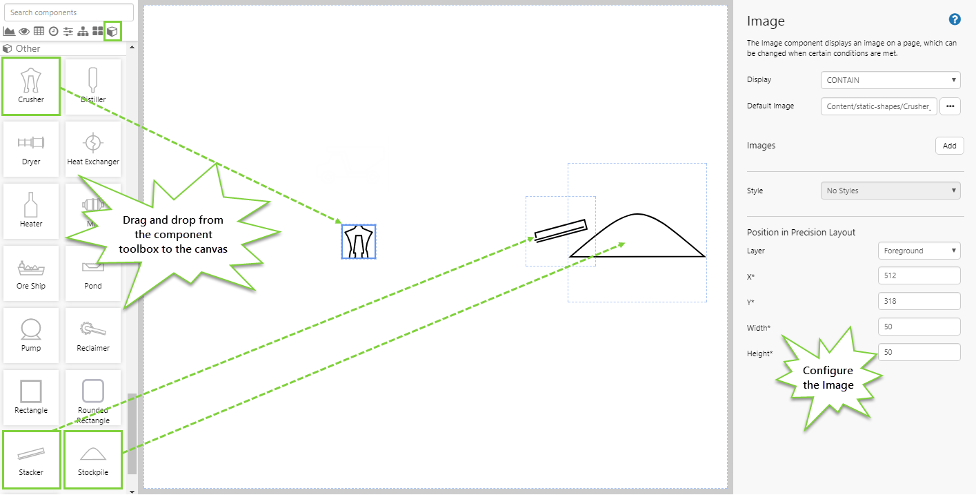 We will start by adding some of these images to the page. Add a Crusher, Stacker, and Stockpile, and configure them as follows:
