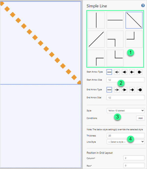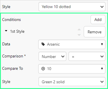A style can be selected, and multiple conditions can be added. The conditions enable a logic flow to be configured, resulting in changes in the line appearance by a different Style being applied when the conditions are met. |