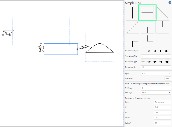 Add a second simple line to join the crusher and stacker. Straight lines are a bit easier to manually position. Configure the line as follows: