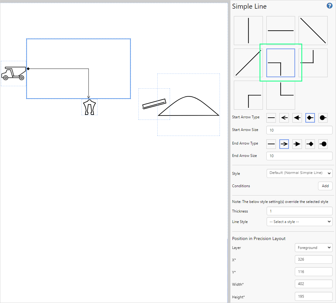 A style can be selected, and multiple conditions can be added. The conditions enable a logic flow to be configured, resulting in changes in the line appearance by a different Style being applied when the conditions are met. |