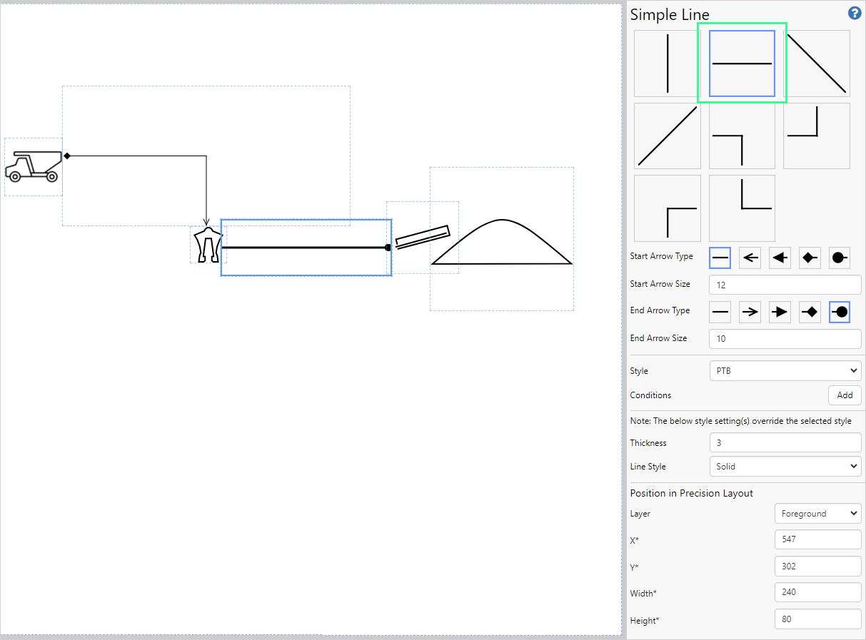 Add a second simple line to join the crusher and stacker. Straight lines are a bit easier to manually position. Configure the line as follows: