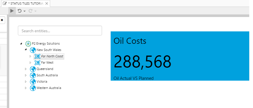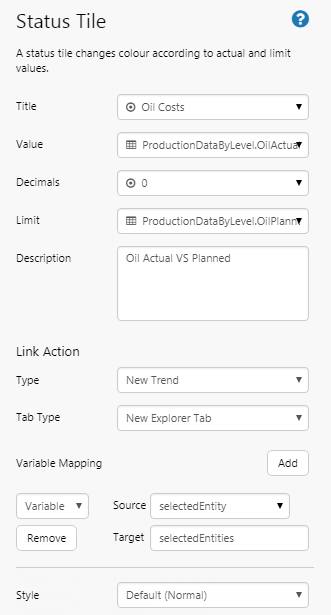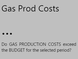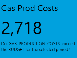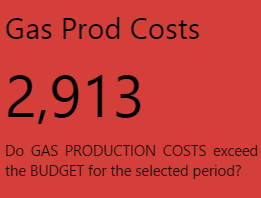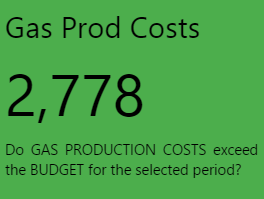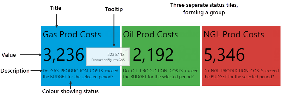 Note how the Status Tiles all show a value. Note the colours indicating whether production costs are equal to, above or below planned costs for Oil, Water, or Gas. Hover over each tile to get the full value, including decimals values (if any).