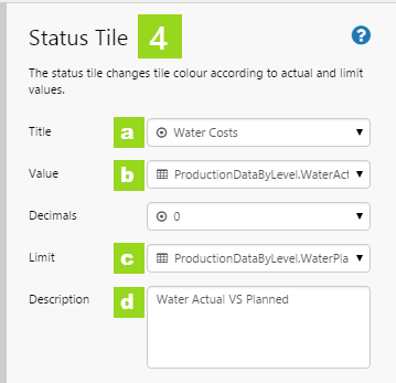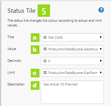 - Status: The colour of the tile, representing whether the status tile's value is below, above, or equal to the tile's defined limit
