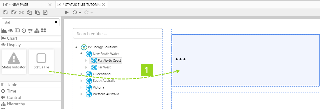 In this tutorial, we'll drag and drop a status tile onto a page, configure it to use data, and then make two copies. The three status tiles will all use the same dataset for their respective values and limits, and we'll add a Hierarchy component so that the user can change the entity (region), controlling what is shown.