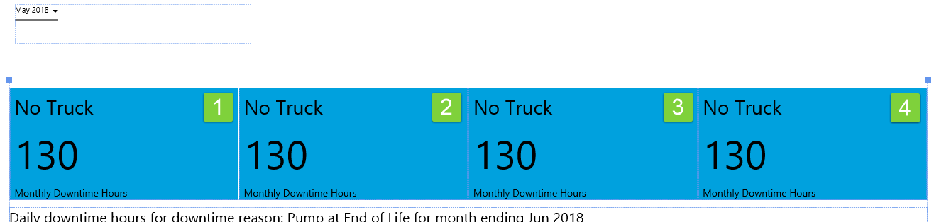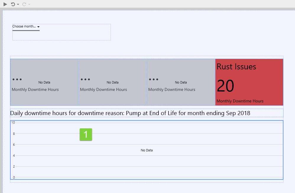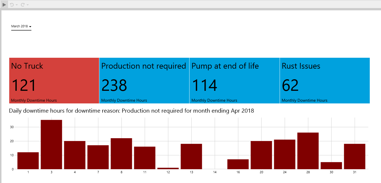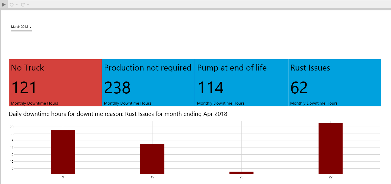 Note how the Status Tiles show a value. If downtime hours for the month are greater than for the previous month, the tile is coloured in red. If less, then the tile is coloured in blue. (Colours may vary if you have chosen a different style.)