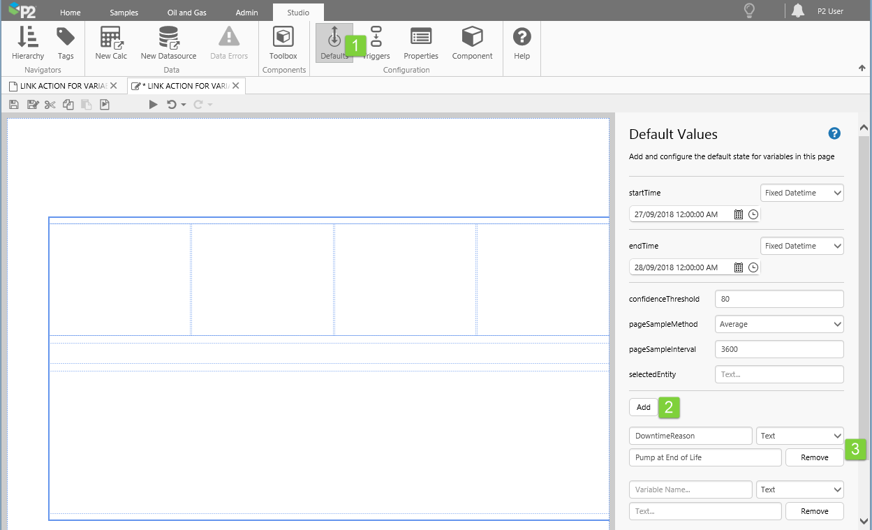 - Step 2. Add a default value for the text variable that each status tile will set: DowntimeReason.
