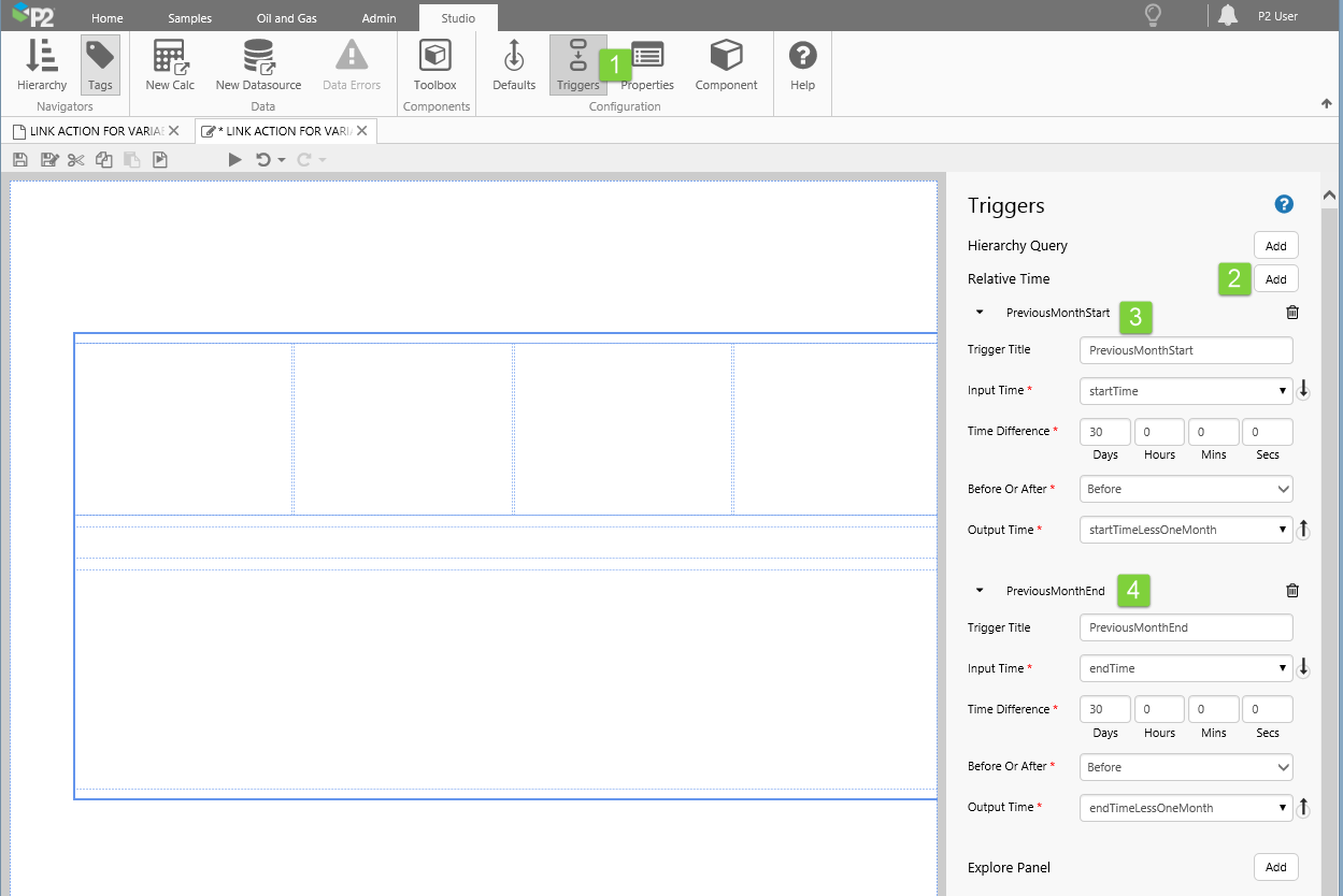 In this step, we're going to add two Relative Time triggers, for setting start and end dates of the preceding month. When the month picker has been added, the page startTime and endTime variables will be one month apart, so we'll use these, respectively, as Input Time to the two Relative Time triggers