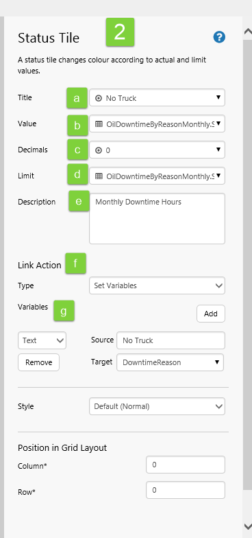 In this step we're going to add a default value for the text variable that each status tile will set: DowntimeReason.