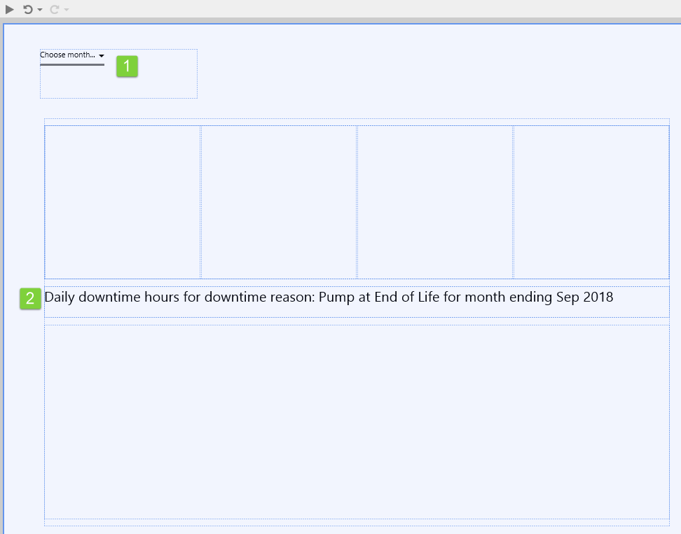 In this step, we're going to add a chart that shows daily downtime hours for the month. The chart's dataset uses the variable DowntimeReason as one of its parameters. Every time a user clicks on a status tile, the DowntimeReason variable is updated, and the chart refreshes to show new data.
