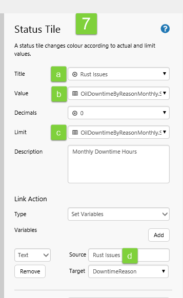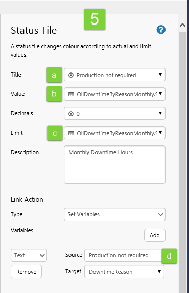 We'll then configure each of the status tiles to have a Link Action type of Set Variables, setting a single variable, and then use the variable as a Dataset Parameter for the Chart below.