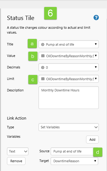 6. Adjust the first copied status tile to use 'Pump at end of life' downtime reason: