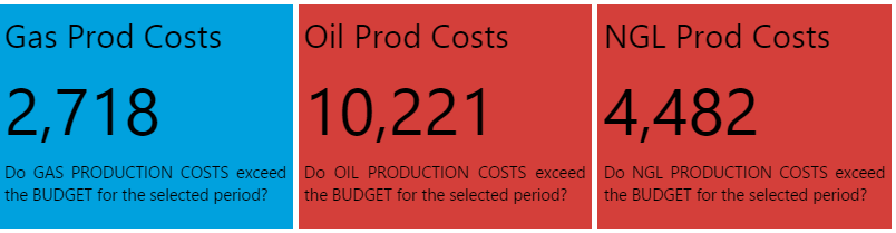 Note how the Status Tiles all show a value. Note the colours indicating whether production costs are equal to, above or below planned costs for Oil, Water, or Gas. Hover over each tile to get the full value, including decimals values (if any).