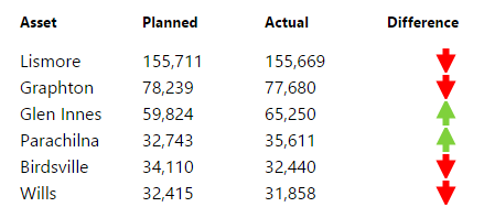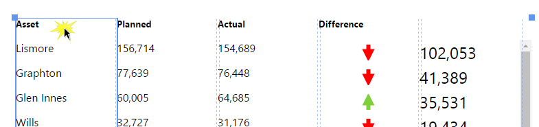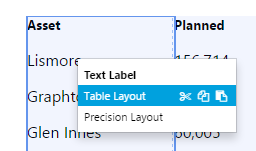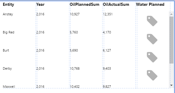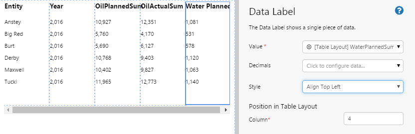 6. The WaterPlannedSum value appears on the table layout. Note how it changes per row. If you look back at the data preview screenshot in Step 1 you can see how WaterPlannedSum is 1081 for entity Anstey, 531 for Big Red, 578 for Burt, etc. The corresponding values are displayed in the Table Layout now, with data integrity maintained for the row.