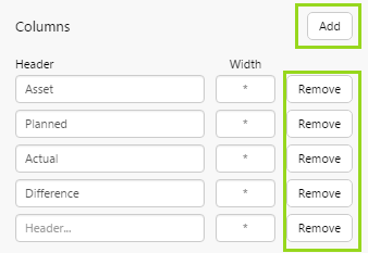 To add a column: Click Add to add a column, then type in a Header and optionally adjust the Width.