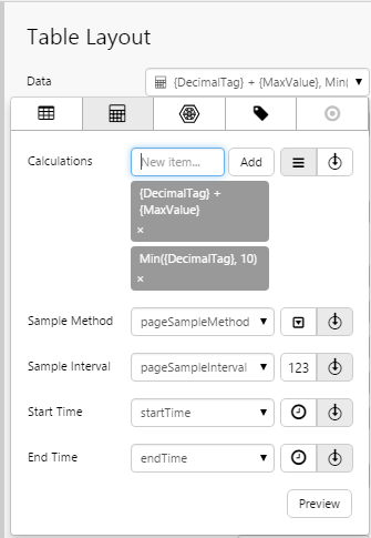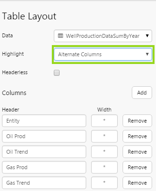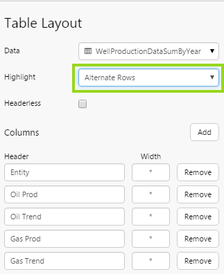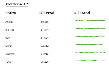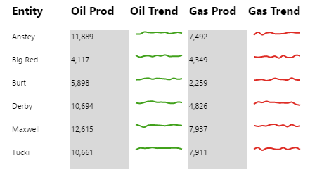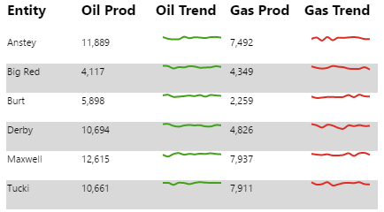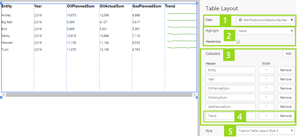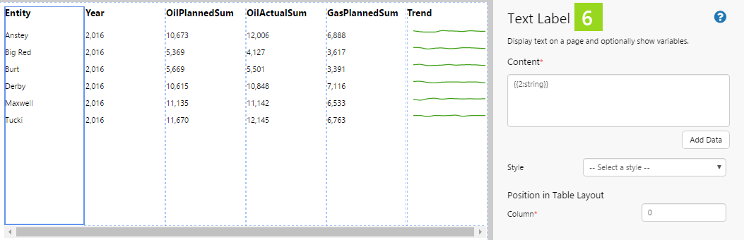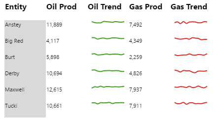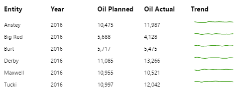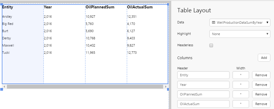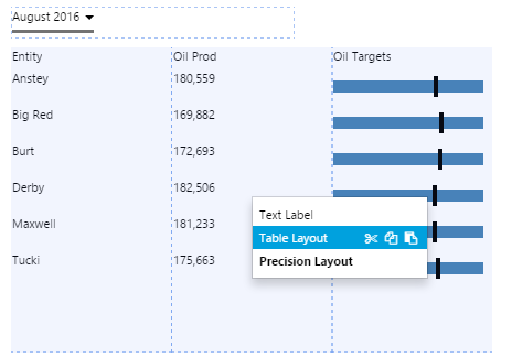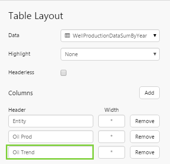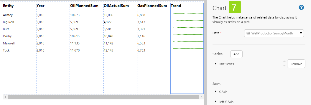The Table Layout content isn’t restricted to its selected data; you can add other components to the layout, and configure them to use contextual data by row. For example, if your table layout's data contains production figures for a group of entities, you can add a chart to the layout (formatted as a sparkline), which shows a trend of production data for the entity in its row, as covered in Tutorial 2.