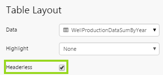 To hide the table layout headers, select the Headerless checkbox.