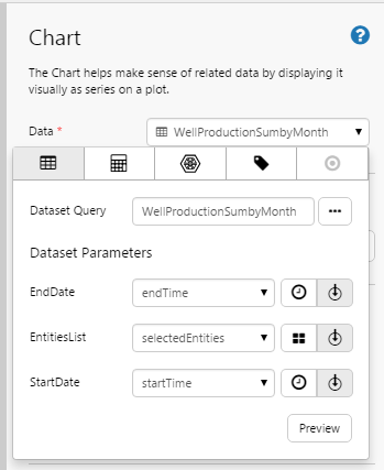 - Select the WellProductionSumbyMonth dataset query from the Oil and Gas Data datasource (or substitute with your own dataset query).