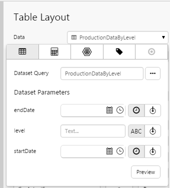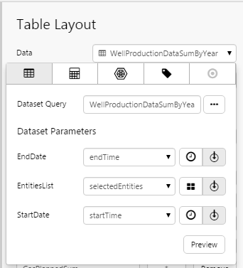 3. Add a dataset query to the Table Layout's data, using the Data Selector for Dataset Queries.
