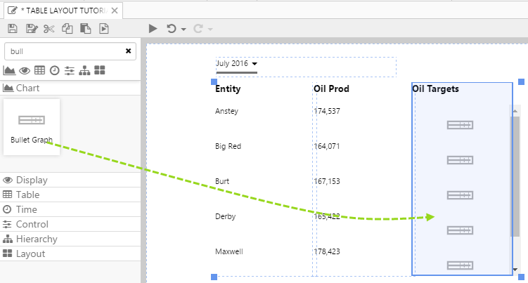 1. Drag and drop a Bullet Graph component onto the last column of the Table Layout (with the header: Oil Targets). The Bullet Graph is in the Chart
