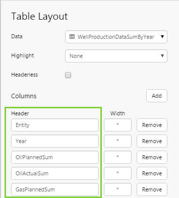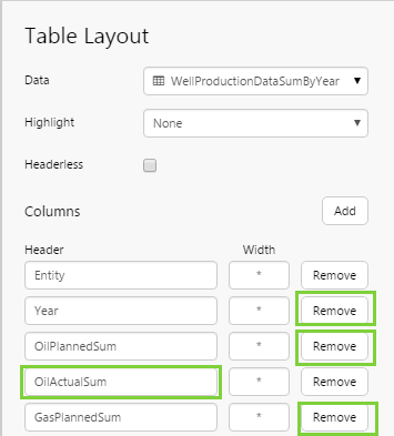 4. Remove the Year, OilPlannedSum and GasPlannedSum columns (click the Remove button next to each), and rename OilActualSum to Oil Prod (type in the Header edit box).