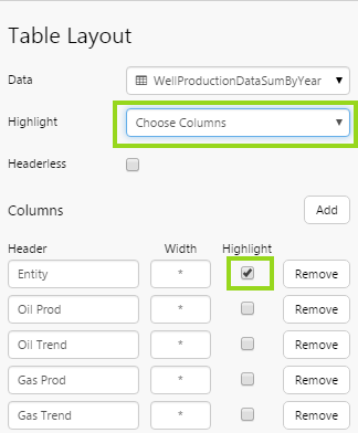 Select Choose Columns from the Highlight drop-down list, then select the Highlight checkbox next to the columns to highlight. |