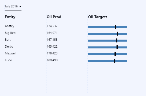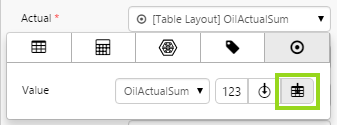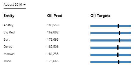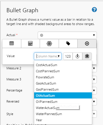 In this step, we'll add a bullet graph onto the table layout, and then configure its value to use a column from the table layout's data (OilActualSum), and compare it to a fixed target value.