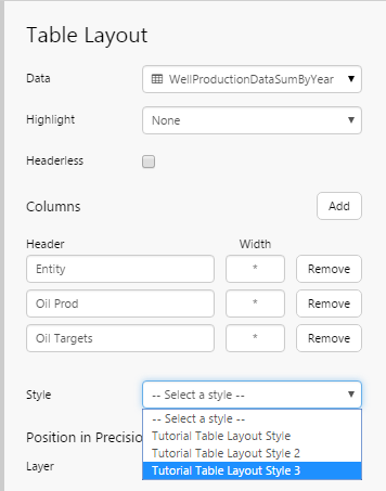 First style the table layout, by selecting a style from the drop-down list. If you are a Style Administrator, you can add a new Table Layout style.