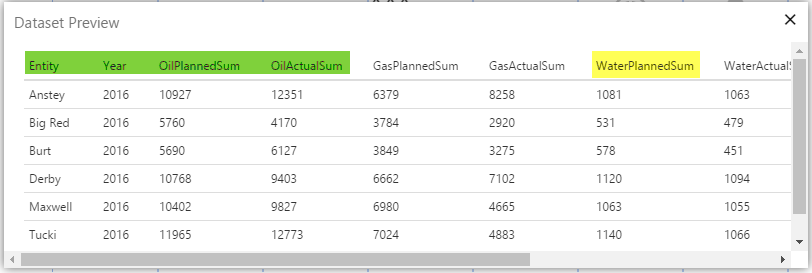 1. A preview of a Table Layout's dataset. Columns highlighted in green are already used in the Table Layout columns. We are going to add WaterPlannedSum, highlighted in yellow, to a new Table Layout column.