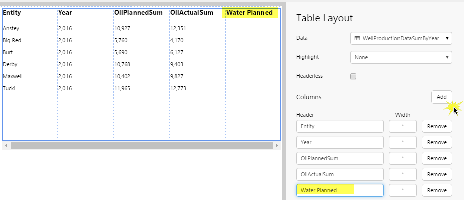 3. We add a new column, by clicking Add, and type in a header: Water Planned. The new column appears in the Table Layout component.