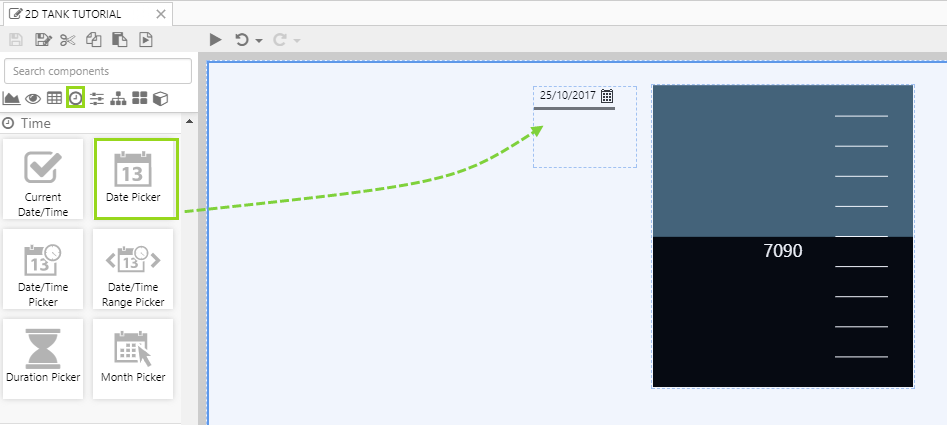 Drag and drop a Date Picker component onto the page, next to the tank, then resize by dragging on one of the corners. The Date Picker is in the Time group.