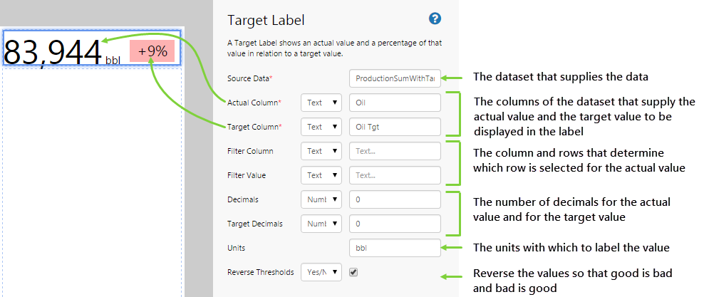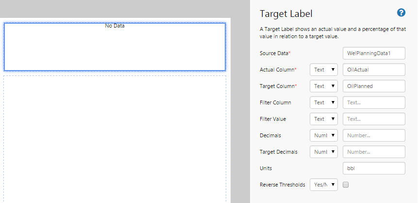 The Target Label is a useful component to display levels. In this topic, we’ll show you how to use the Target Label to display actual vs target production data for a selected well. This is often used in production summary reports.