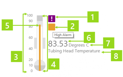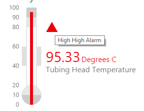 The temperature meter's appearance is partially based on the configured in the design mode, and partially based on the measured data and the alarm limits.