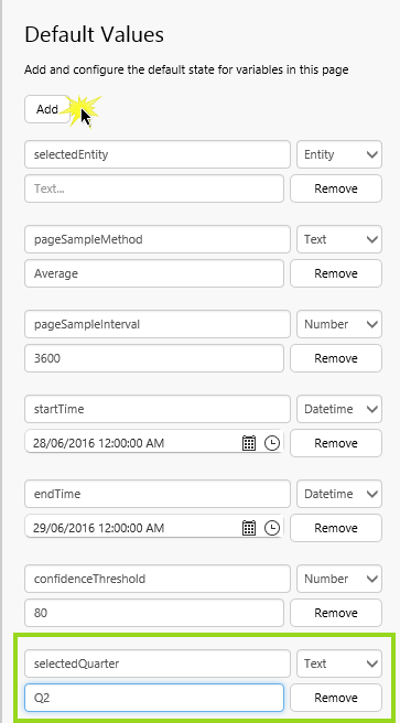 2. In the Default Values panel, click Add, scroll to the bottom of the default values list, then type a variable name, selectedQuarter, into the edit box, keep the Type as Text, and type a default value, Q2, in the second edit box.