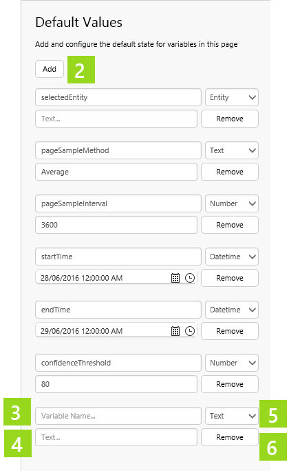 2. Click Add for every default value you want to add; variables used in the Explorer page, or as dataset parameters, can be referenced here by Variable Name.