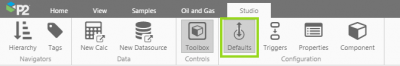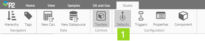 1. Click the Defaults button on the Configuration tab group of the Studio ribbon, to open the Default Values panel. To close the Defaults Panel click any button on the Configuration tab group.