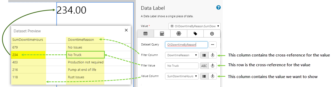 When using dataset data, many components allow you to specify Filter Column, Filter Value, and Value Column fields. These are designed to be used together to act as a lookup table of sorts, in order to get the corresponding value from another column in the dataset. In some cases, only the Value Column is required.