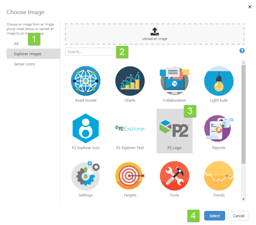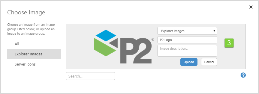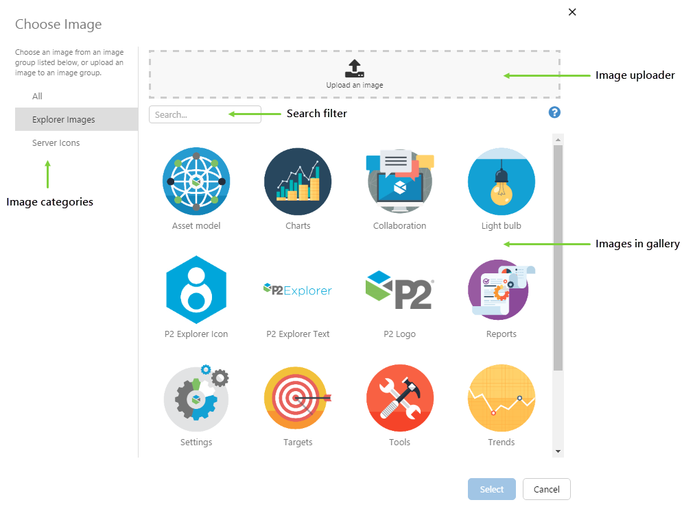 The Image Gallery allows you to insert an image from P2 Server, into a P2 Explorer page. If you have the requisite permissions (Server Editor role), you can also upload an image.