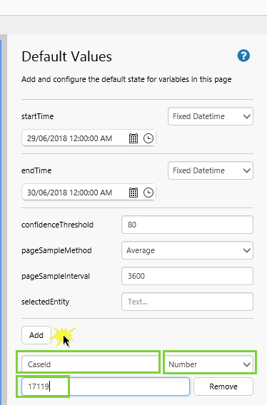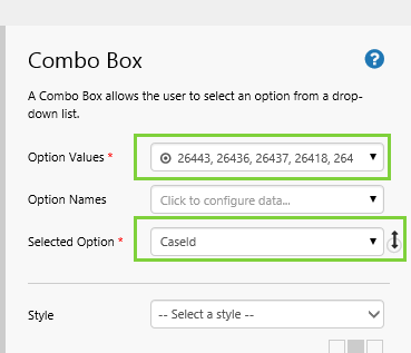 - Option Values: Add a list of Case Ids: 26443, 26436, 26437, 26418, 26419, 26404, 26406 in our example, plus the one used for the CaseId default value: 17119.