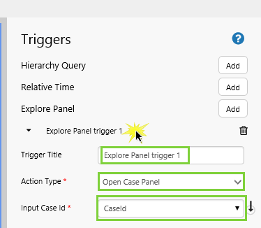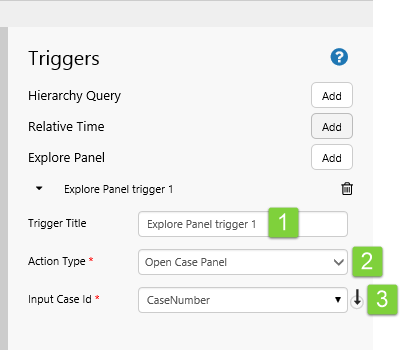 The Explore Panel trigger opens the Explore panel, every time the configured variable changes. In Explorer version 4.6.1, this trigger can be used to open Case details in the Explore panel, and the required variable is a case id.