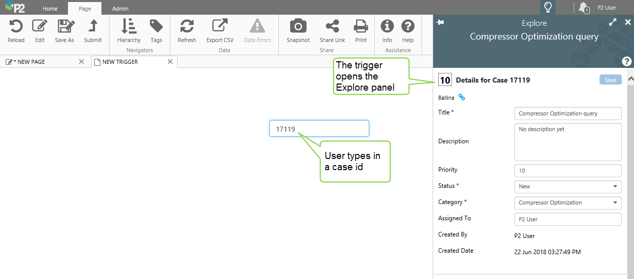 You now have a functioning Explore Panel trigger, whose CaseId variable is updated by the user's selection from the Combo Box.
