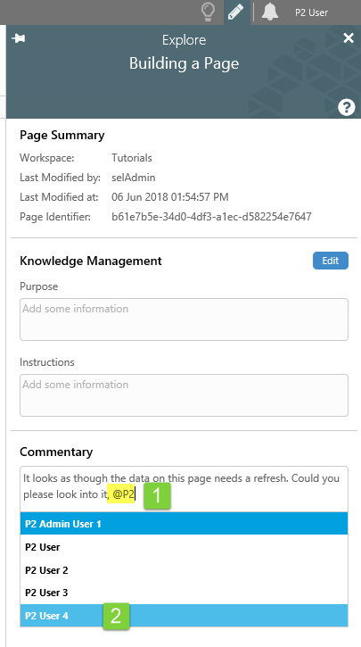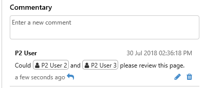 When you add a user to a comment by using the @ symbol, their name appears in a pill in the comment, together with a user