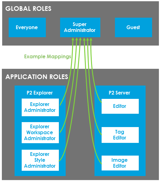 Global Roles can be used to represent specific categories of users in the business (e.g. Engineering, Operations, Management, IT). You can then associate one or more Application Roles with the Global Role. For example, you may want all users in the IT Global Role to have 'Explorer Administrator' (a P2 Explorer application role) privileges as well as 'Editor' (a P2 Server application role) privileges.