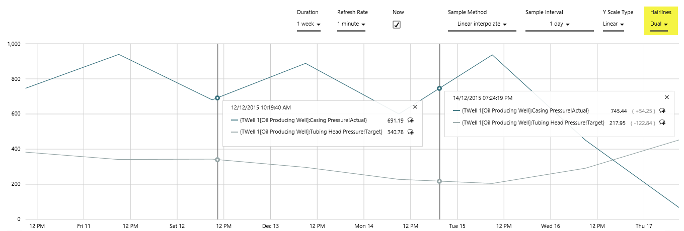 Add a hairline to view values (if any) for all trended tags at a particular point in time. You can leave a comment for a trended tag at the hairline point, or view and reply to other comments.