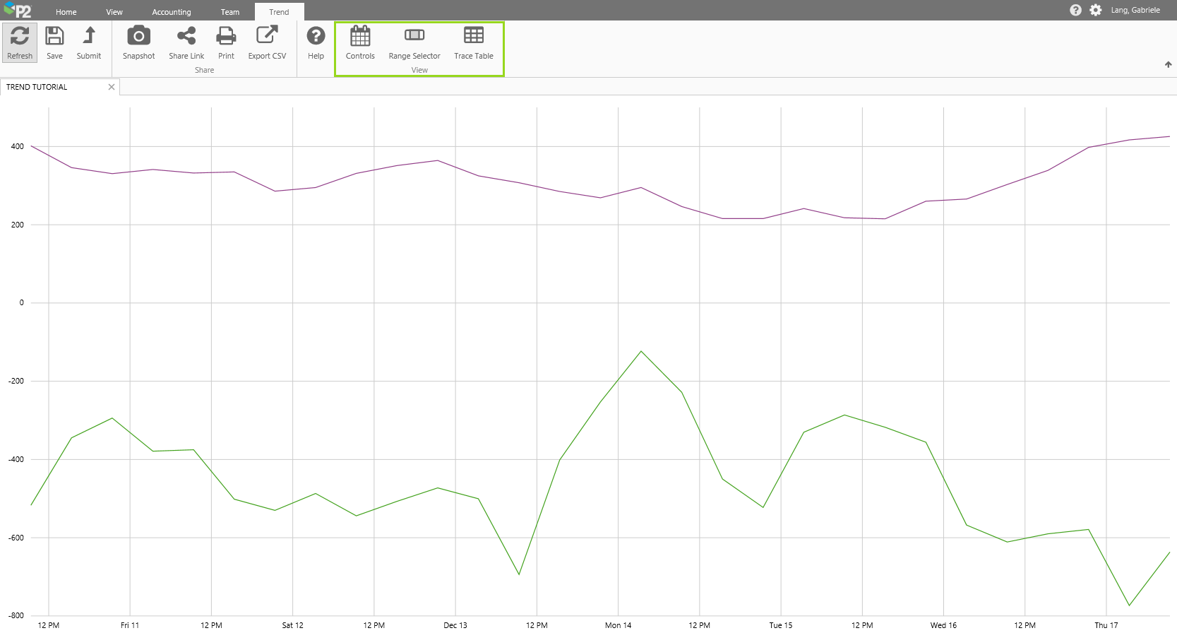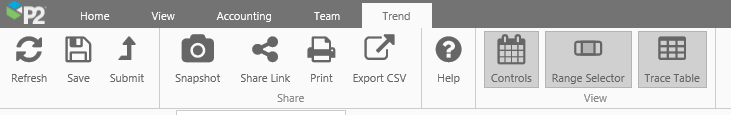 Trend Ribbon Tab Use the buttons on this tab to refresh, save, or share the trend. (Refresh, Save, Snapshot, Share Link, Print, Export CSV) as well as a link to the online help (Help) and toggle buttons to show or hide elements of the Trend (Controls, Range Selector and Trace Table).