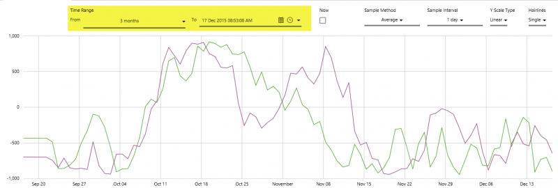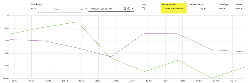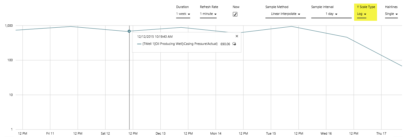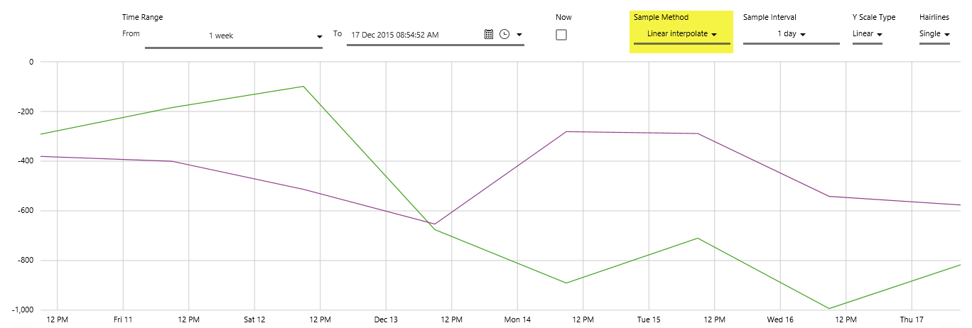 In this step, we'll experiment with changing the Time Range, we'll select Now, we'll update the Sample Method and Sample Interval, the Y Scale Type and the number of Hairlines. Note that the selections affect how much data is returned, thus affecting the time taken to render the trend.