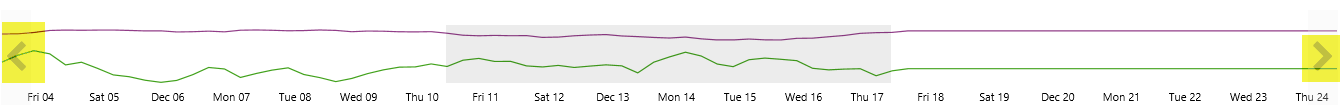 Click on the left or right arrow to move the start and end date of the range selector. Note that the dates on the highlighted section do not change; the highlighted section just moves across (to left or right) in relation to the changing start and end dates of the range selector.