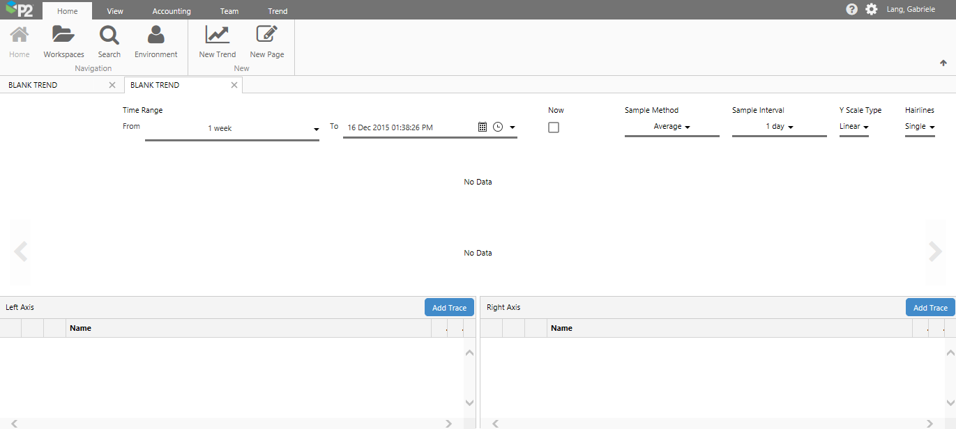 To create a trend, you need to open a new blank trend and then add tag or attribute data to this. The screenshot below shows a new trend, with two attributes: